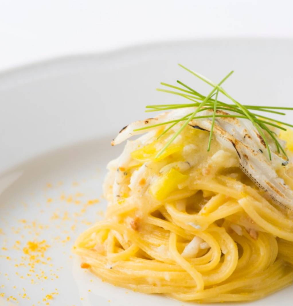 【現行ディナーメニューの一品】 Menù 2026.02.19 この時期 限定のパスタ! 霞ヶ浦のシラウオ 剱持さんの深谷ネギのピュレ 黄ニラ 自家製タリオリーニ サルデーニャ産カラスミ Buon appetito ! ホームページからもご予約可能です!